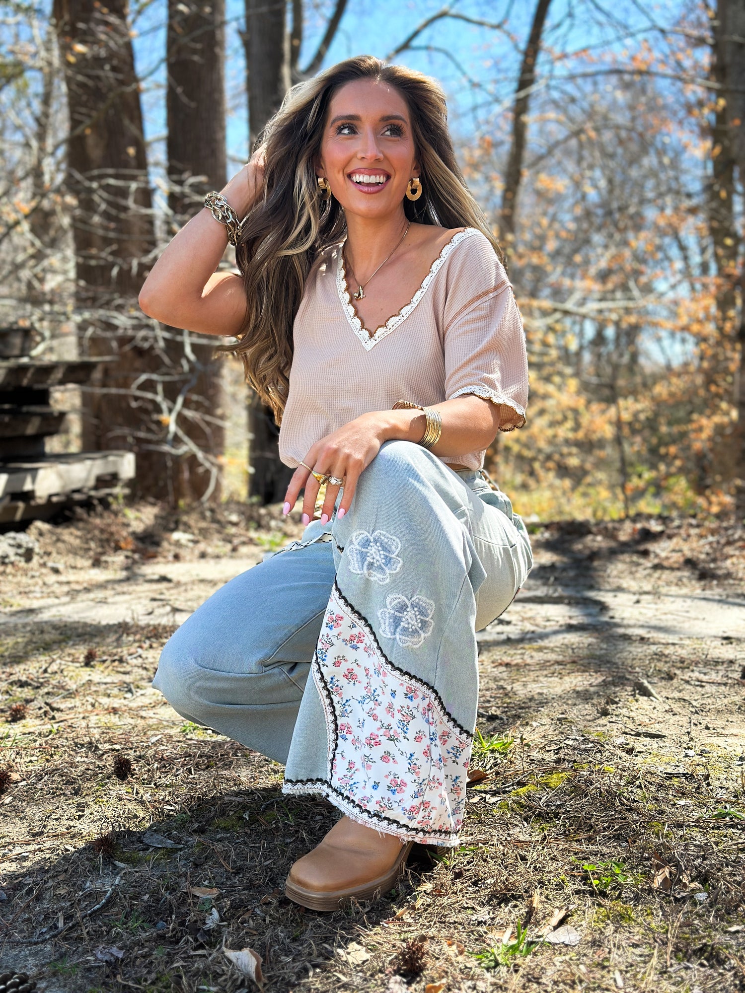 Pol Clothing - V-neck lace trim short sleeve stitch detail solid basic knit