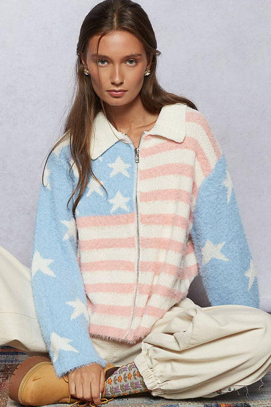 Pol Clothing - Collar neck long sleeve American flag mohair sweater jacket