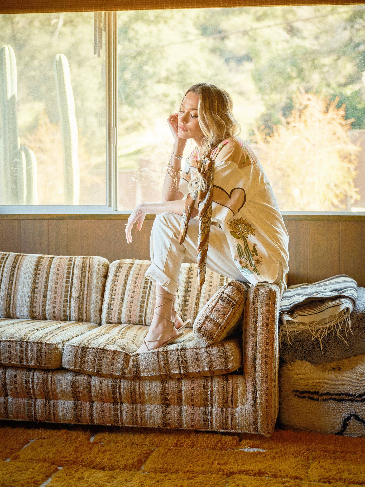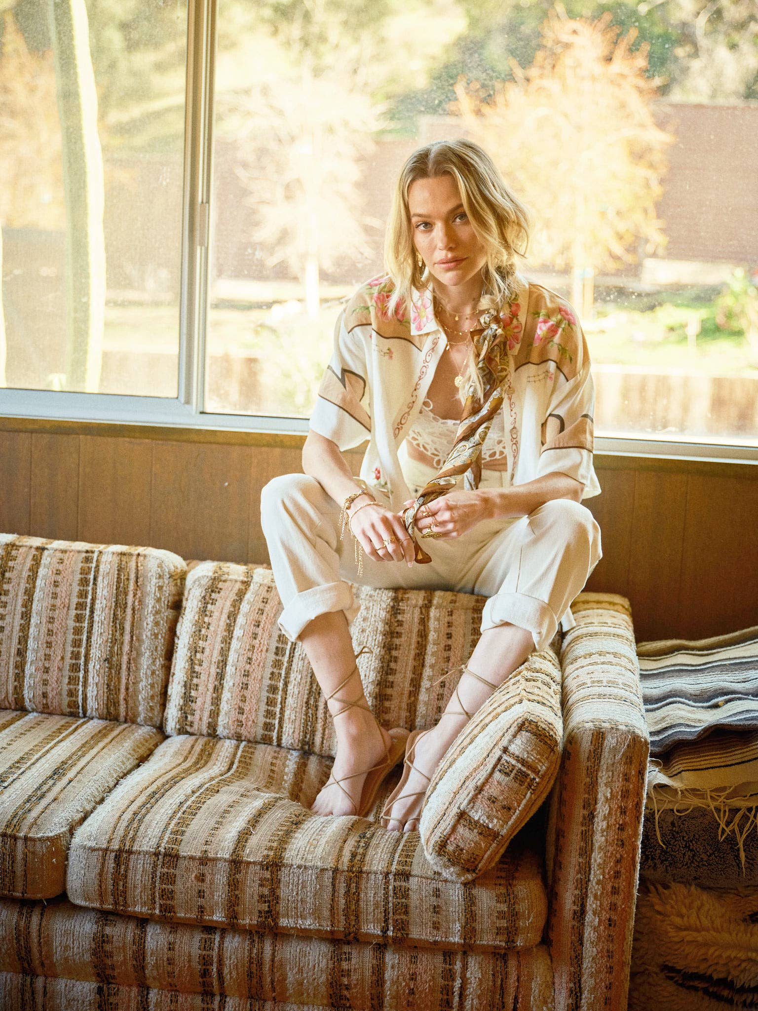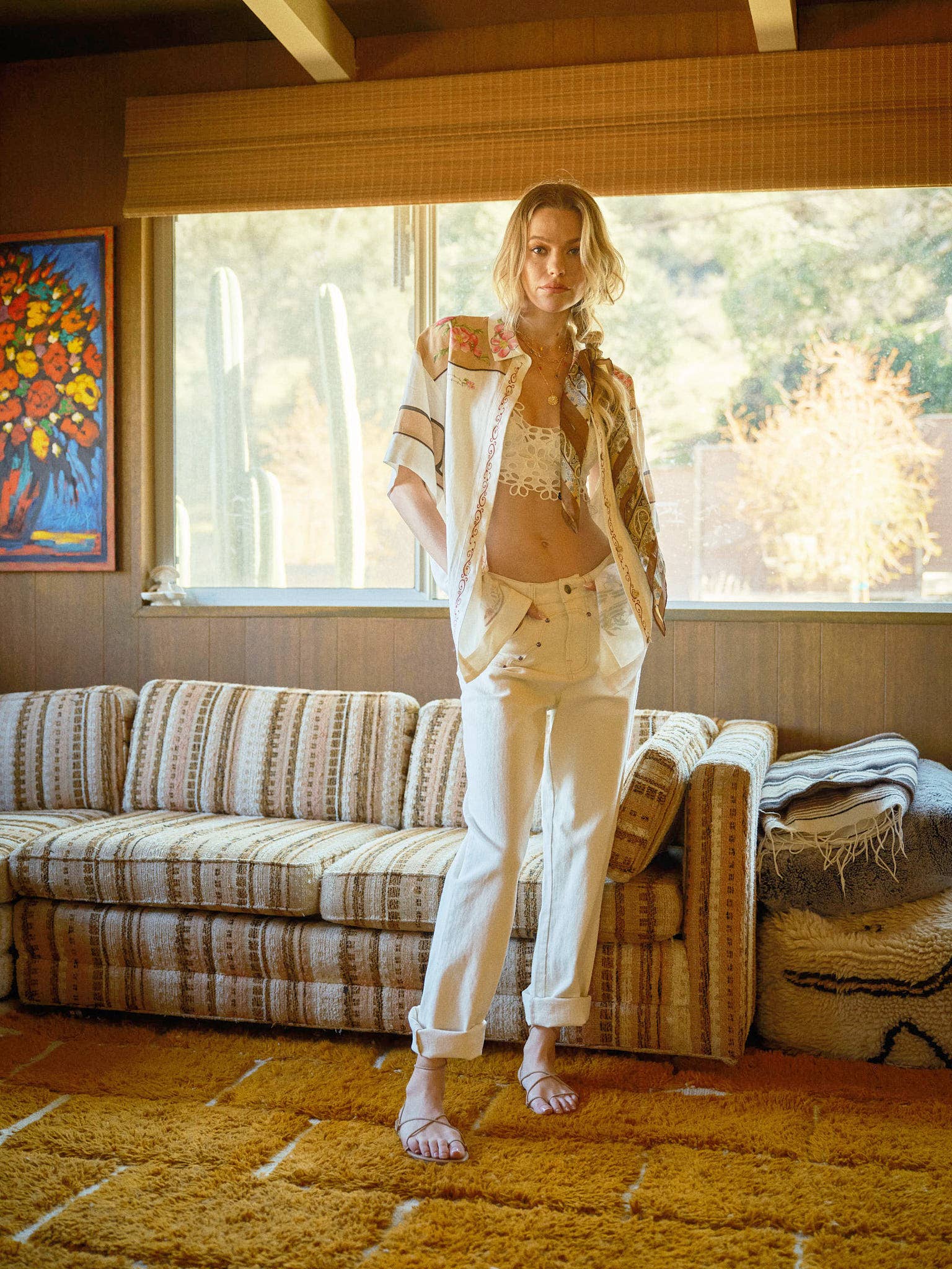 Delicate embroidery, printed florals, sequin sunflower embellishments, and piping details elevate this cotton-linen blend button-up—perfect for lounging by the water.