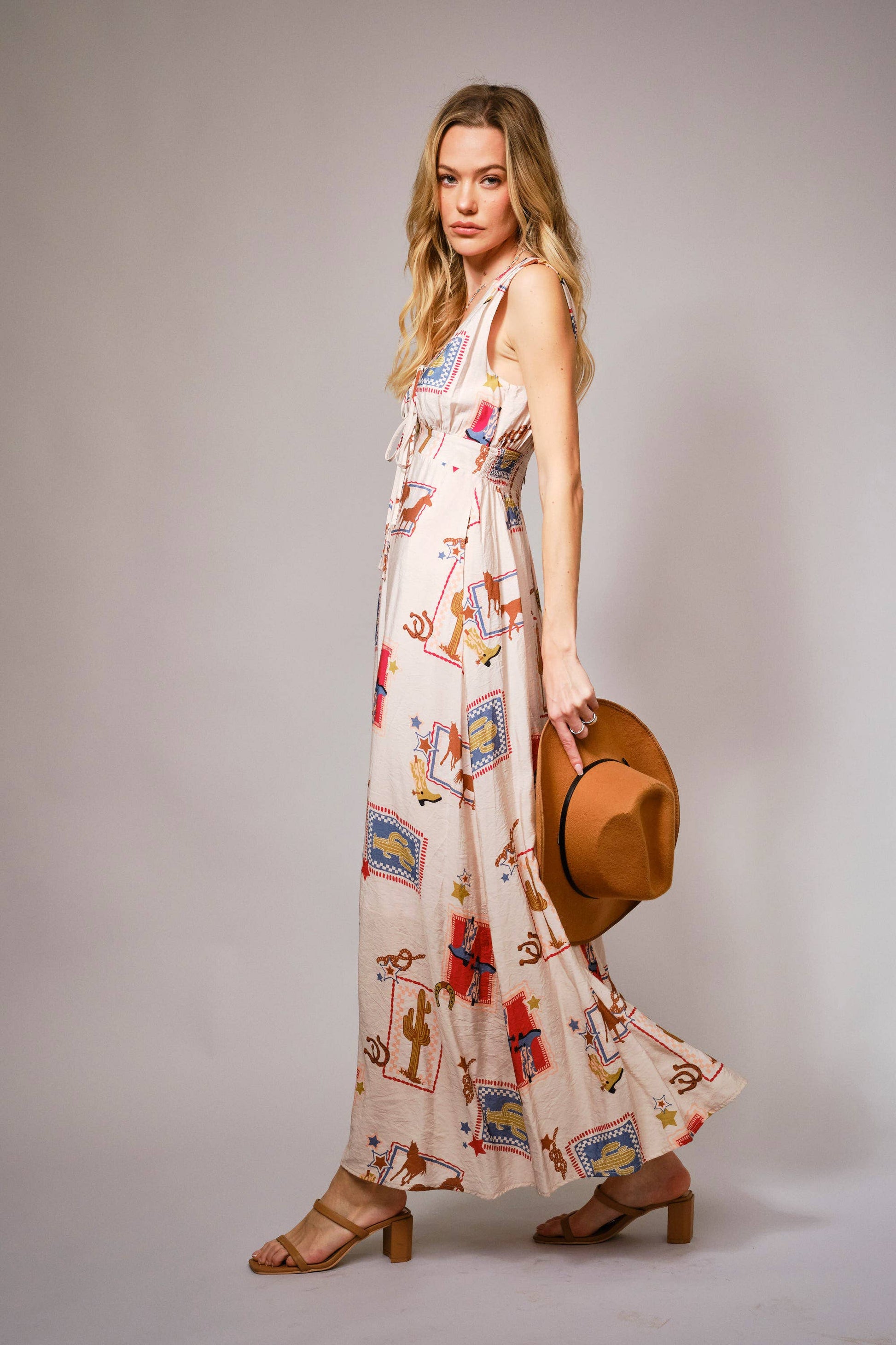 Elegant maxi dress with a Western-inspired print, featuring a tie-front neckline, smocked back, and a flowy silhouette. Ideal for summer fashion, bohemian style, and casual outings. Perfect for festivals or rustic chic looks.