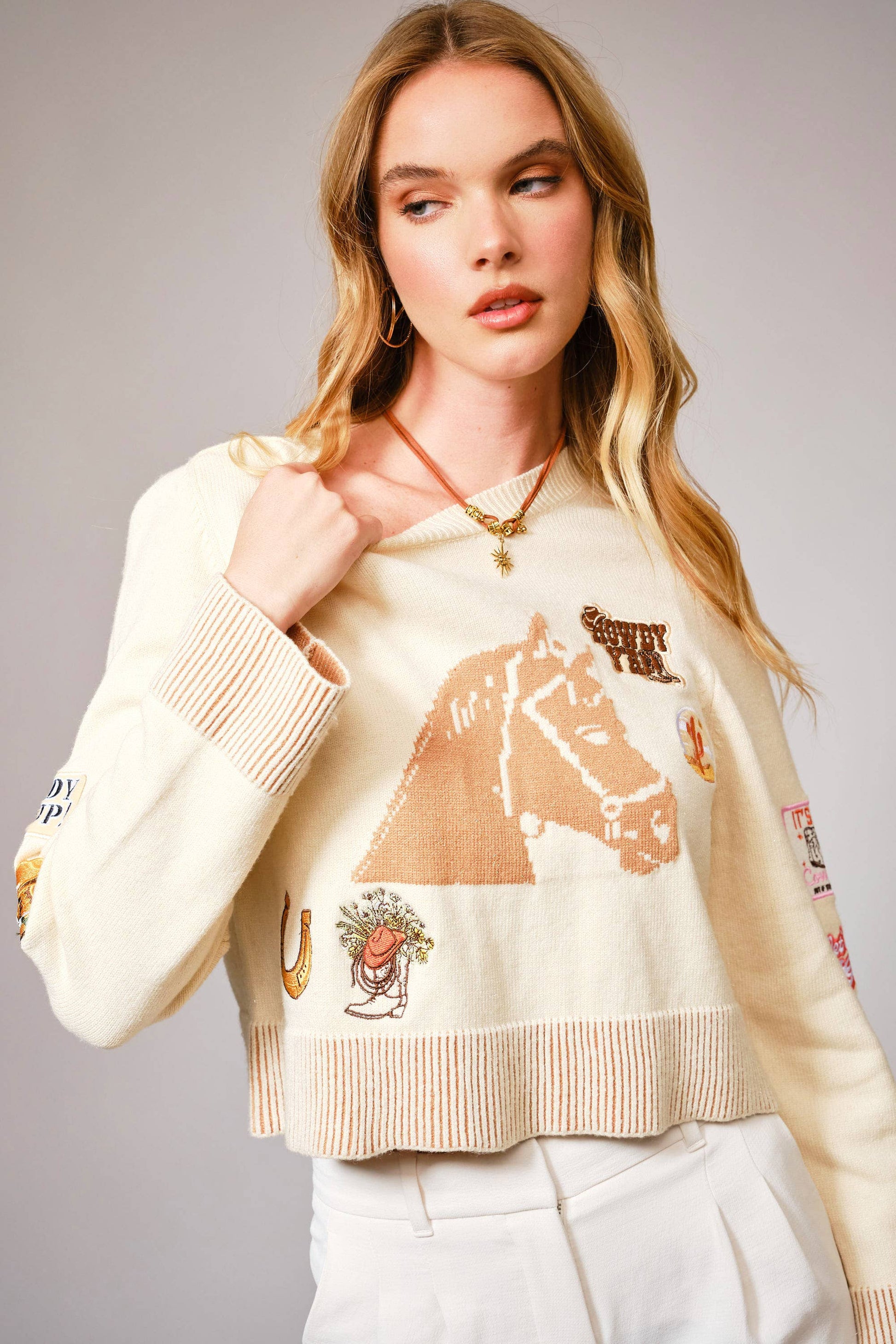 Ivory crop sweater with horse graphic, western patch accents, and soft lurex shine on comfy knit