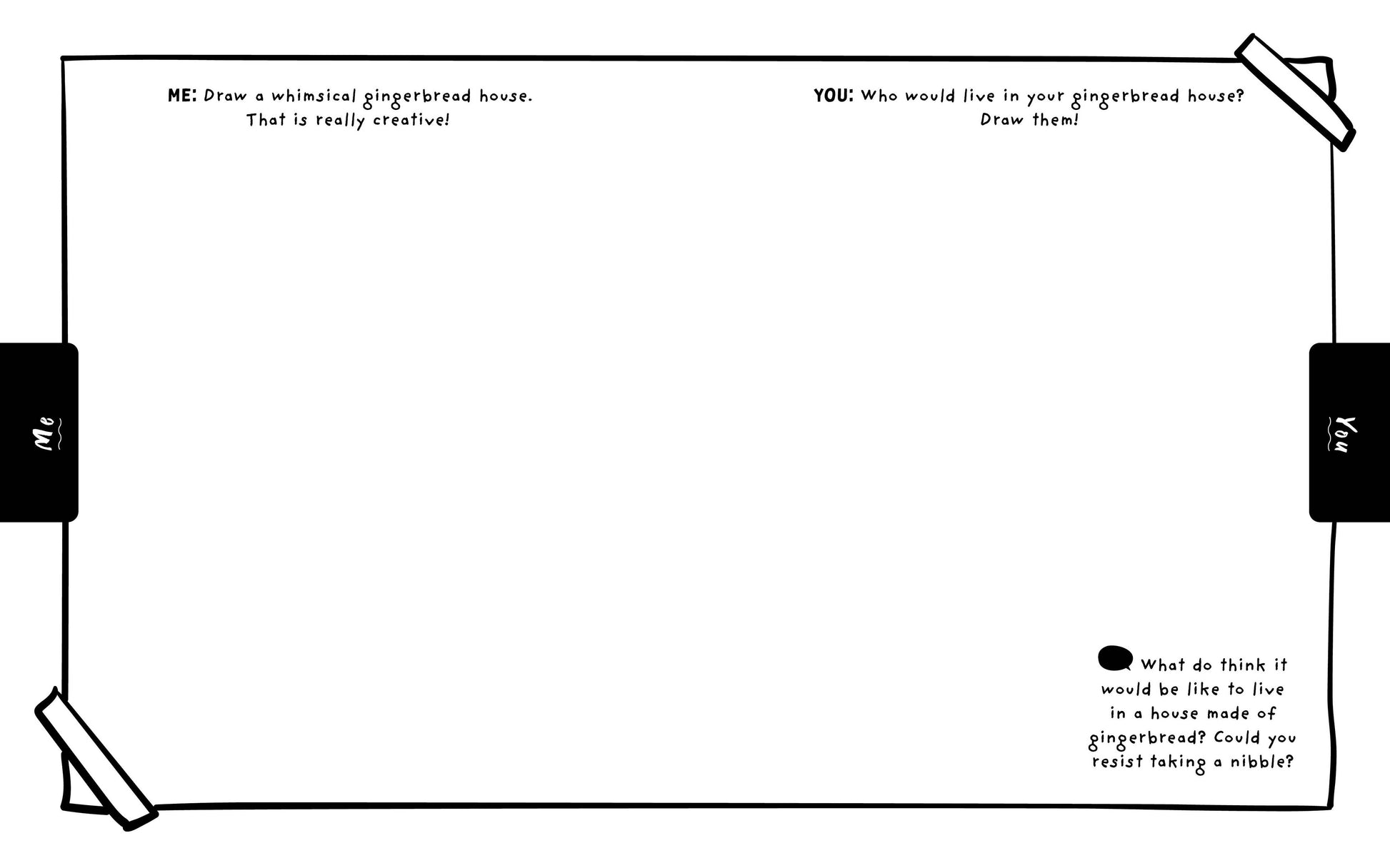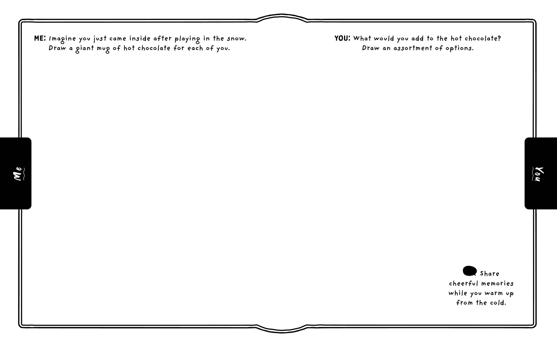 Start your creative engines. . . it’s time to draw with friends and family during Christmas! One hundred pages of delightful prompts will get you both drawing—and talking—together! Some prompts can be done simultaneously, while others require you to do your part first and the other people to do theirs after. You’ll also find mini conversation starters to get you talking along the way. Your first prompt awaits . . . let’s go!