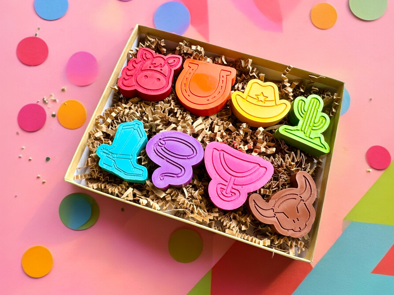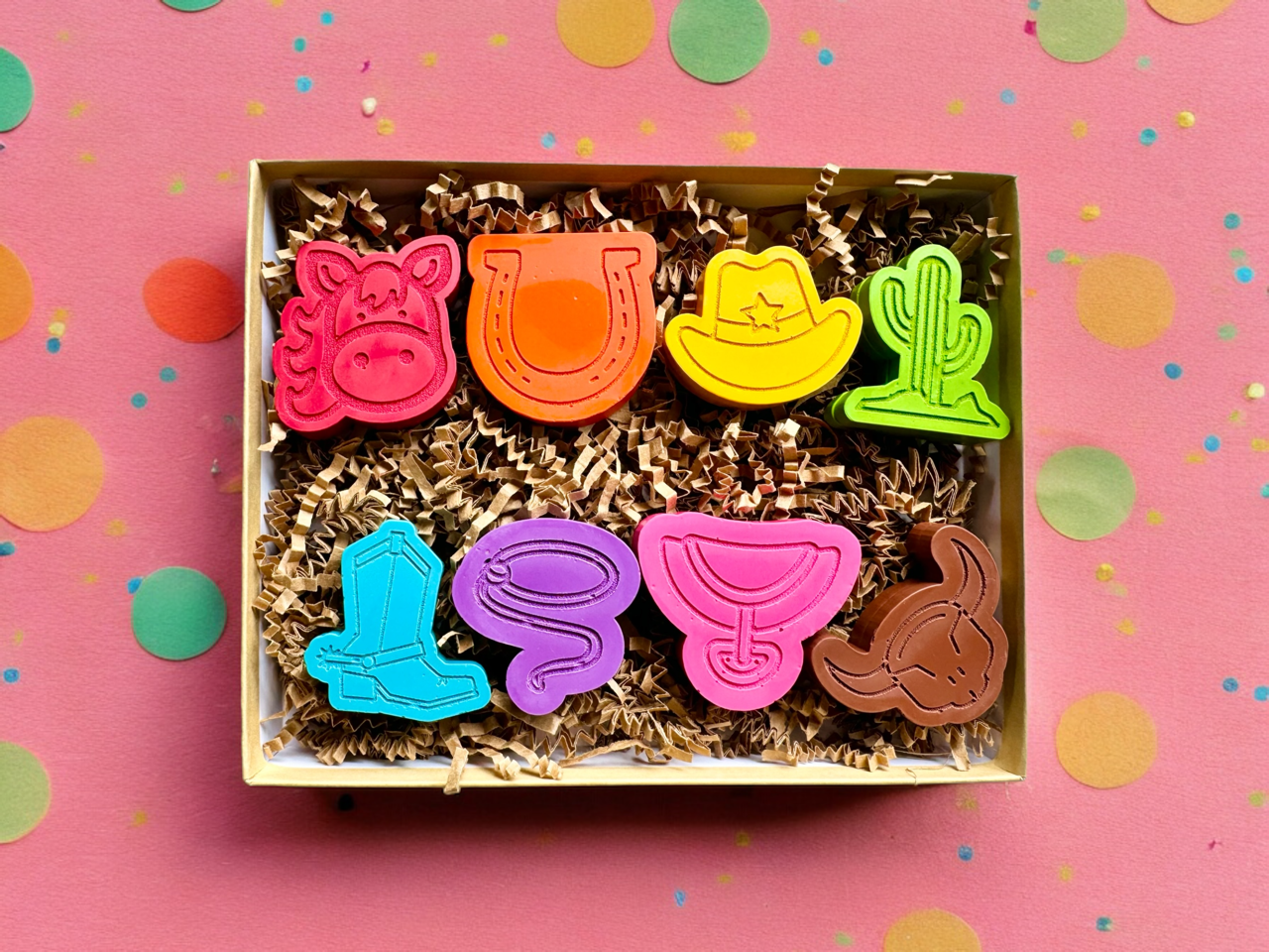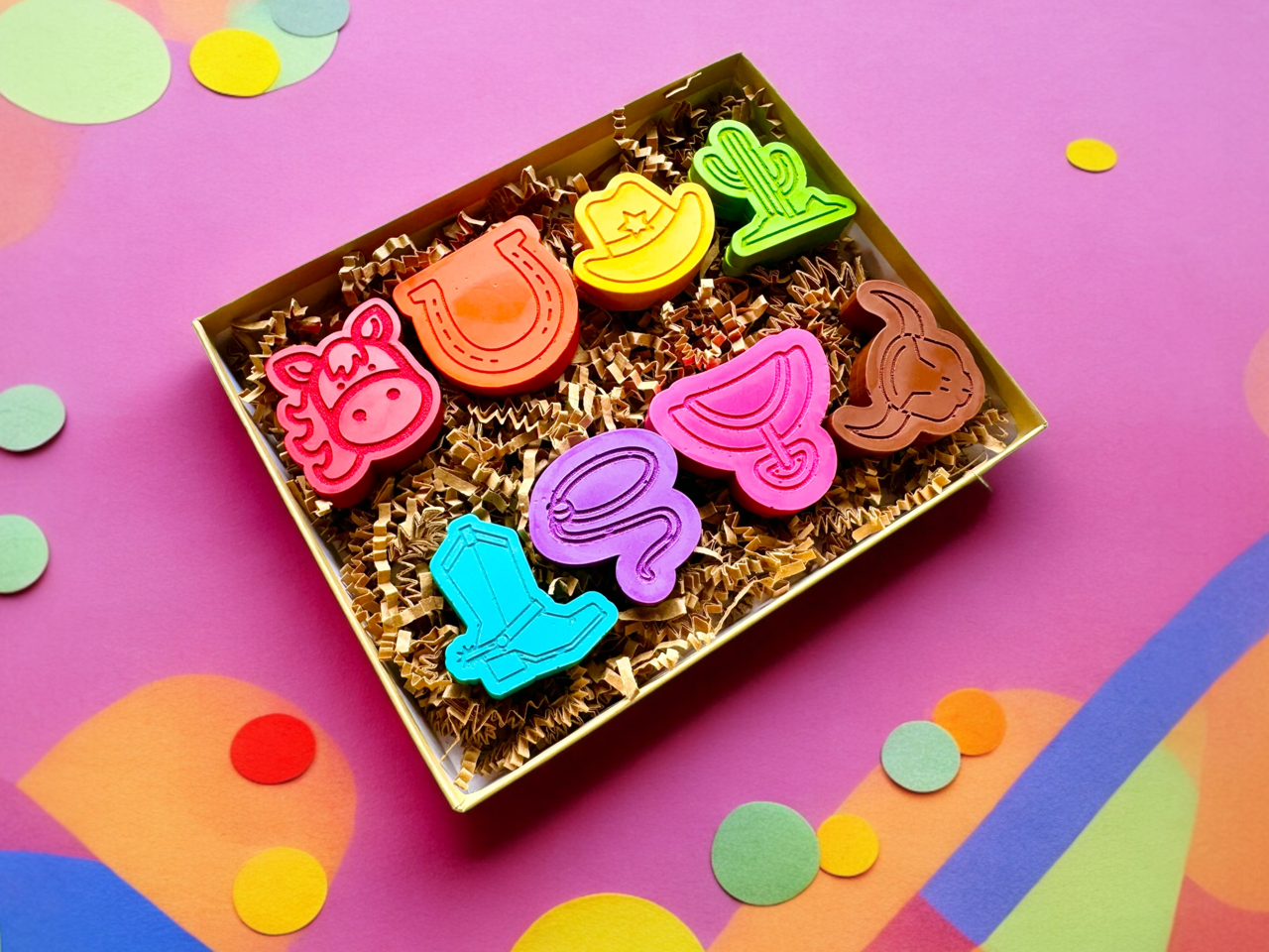 1 Set of 8 Wild West Crayons in a 5"x7" Gift Box (horse, horseshoe, hat, cactus, boot, saddle, lasso, desert skull)