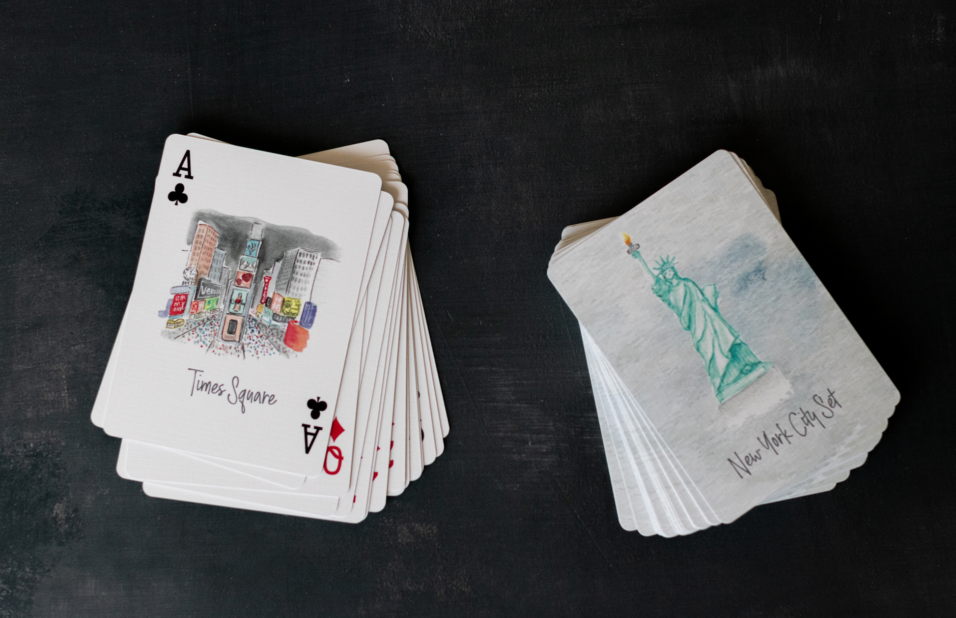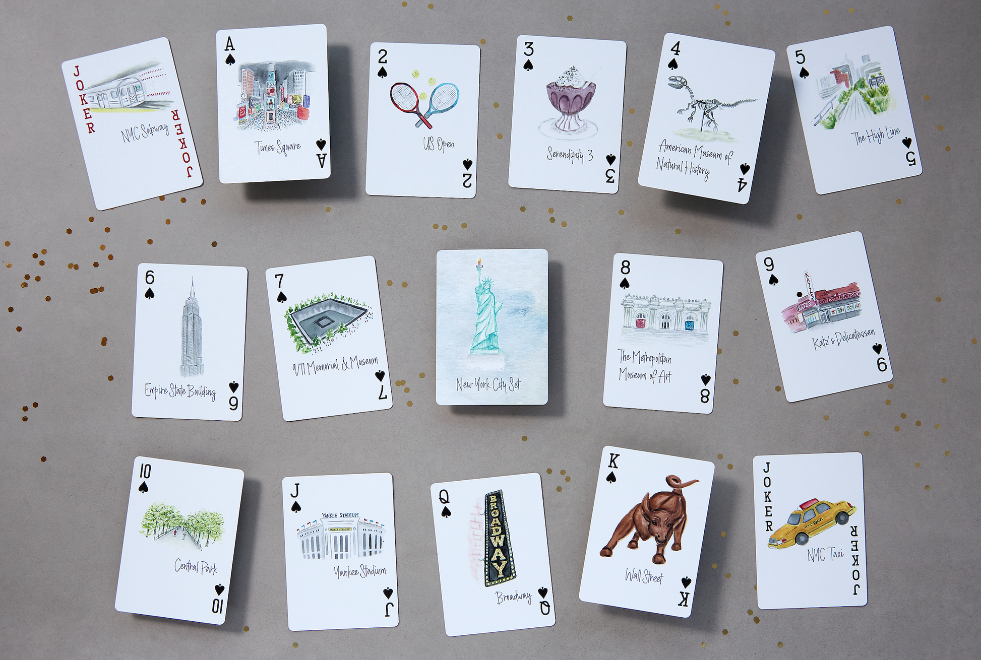 New York City, New York themed playing cards featuring 16 different unique watercolor images. Including, Times Square, US Open, Serendipity, Museum of Natural History, The High Line, Empire State Building, 9/11 Memorial, The Metropolitan Museum, Kat'z Delicatessen, Central Park, Yankee Stadium, Broadway, Wall Street, the Subway and Taxis, and the Statue of Liberty.