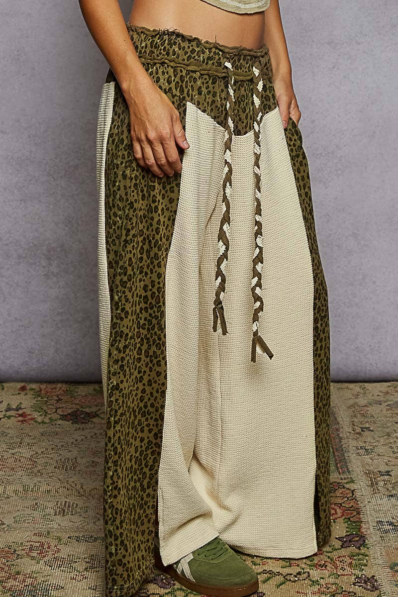 Designed in straight fit pants in thermal with animal printed contrast and waist string detail.
