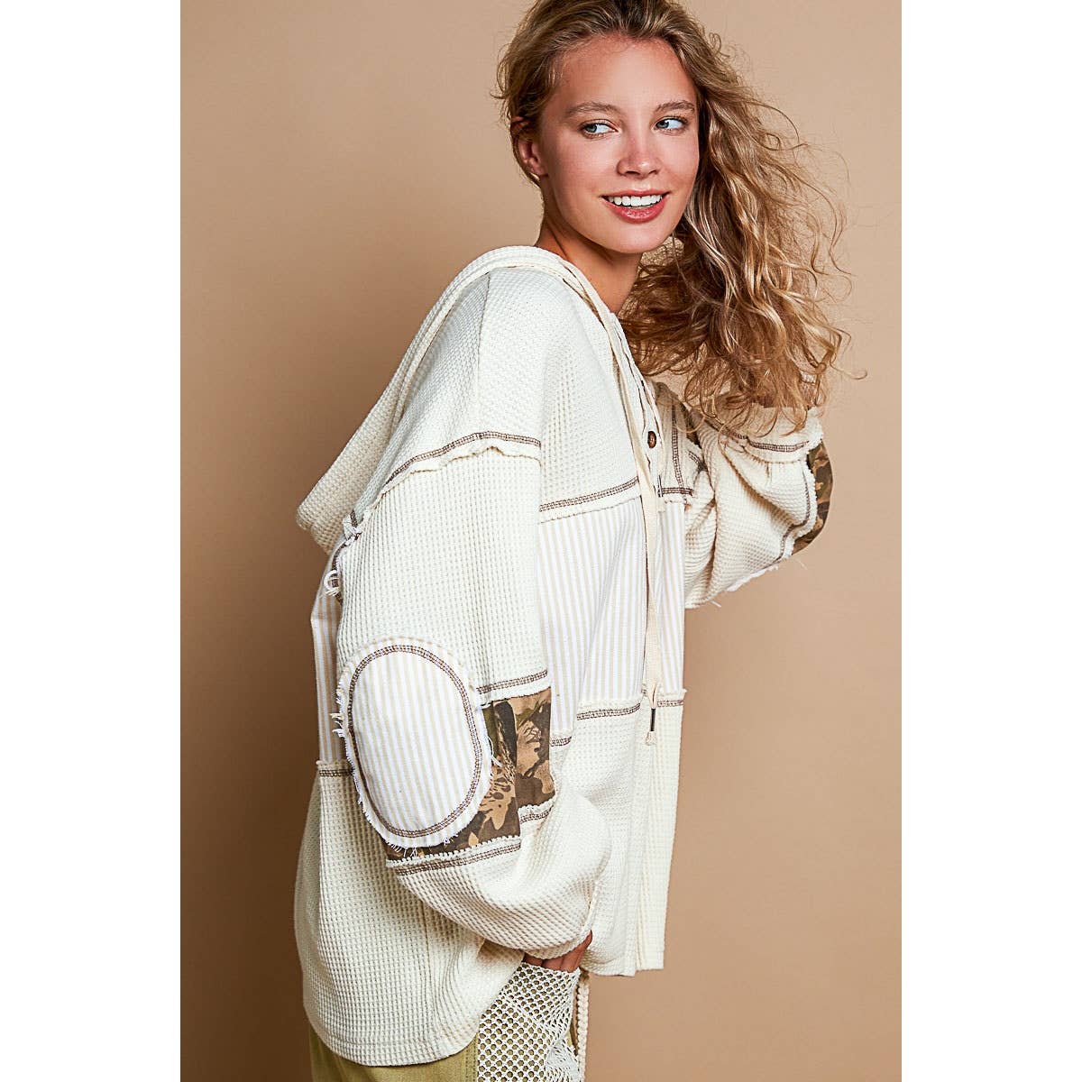 Designed in placket hoodie, balloon sleeve, relaxed fit top in thermal and printed woven mix with stitch detail pointed striped and printed pattern.