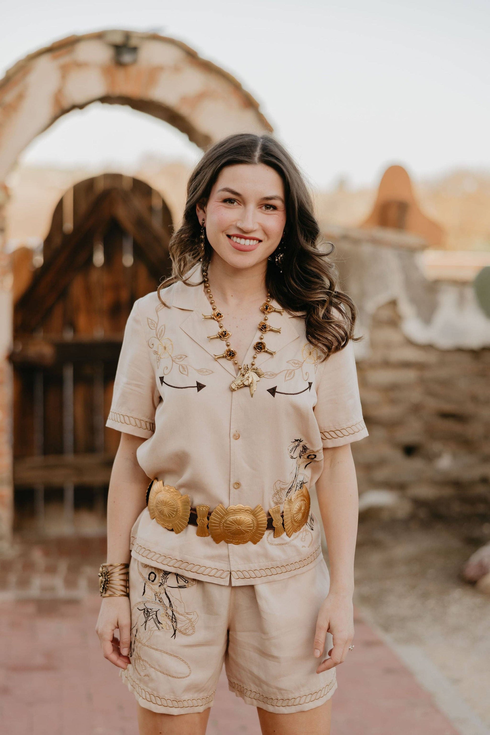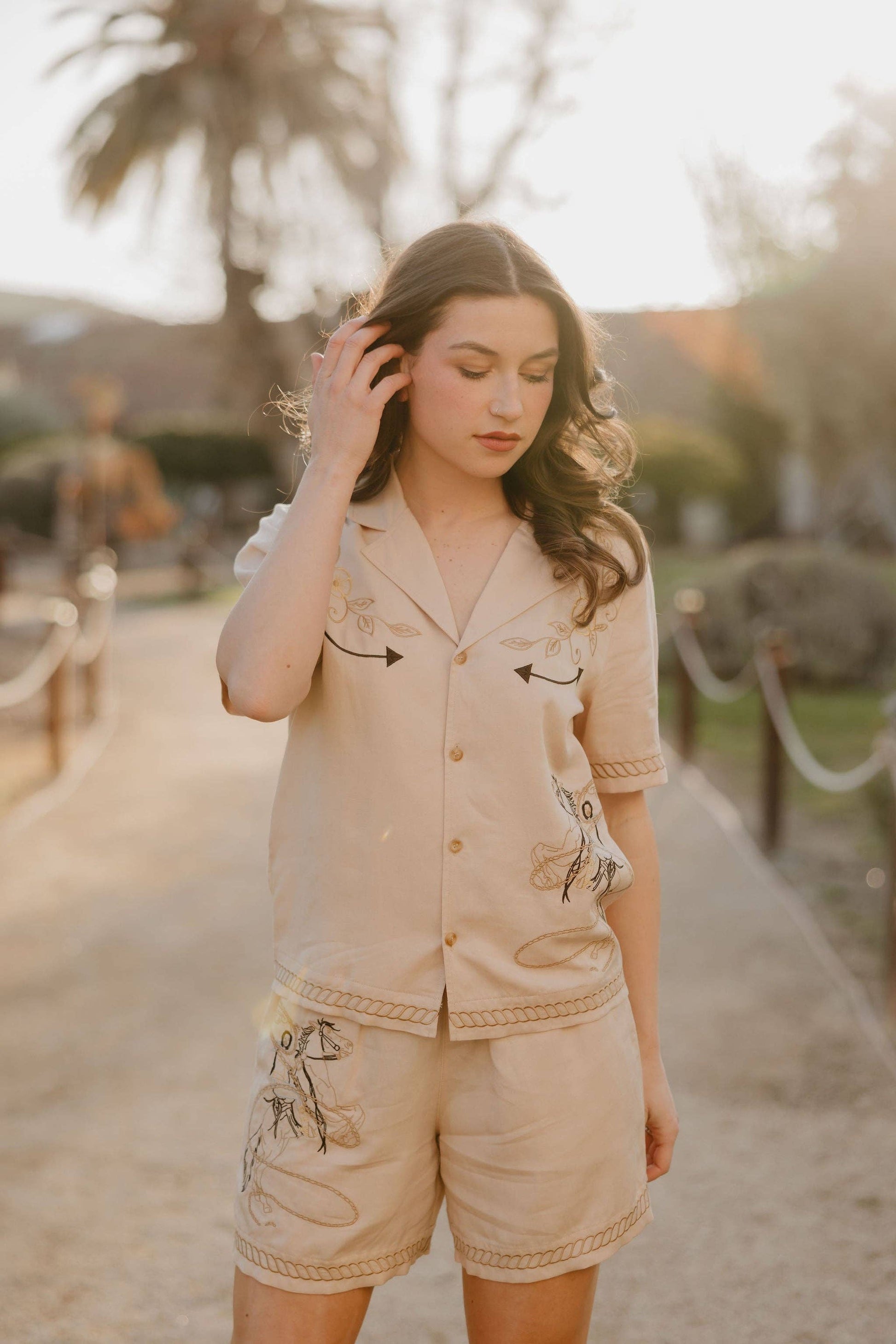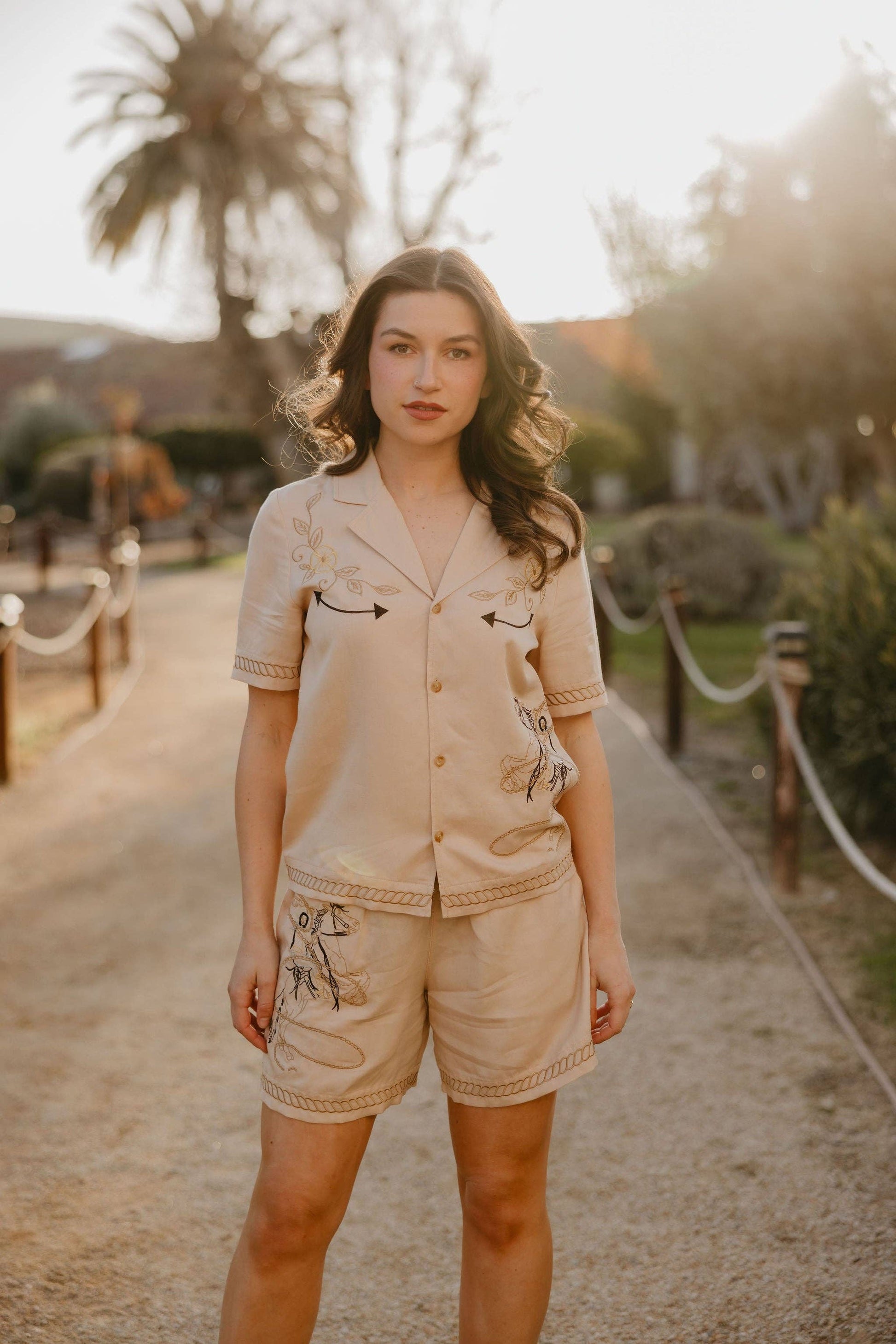 The Rancho Calleguas Short is all comfort, no compromise—soft tan fabric, an easy drawstring waist, and western charm in every stitch. An embroidered bronc rider up front and a lucky horseshoe on the back pocket bring serious cowgirl energy. Weekend plans? These shorts are already packed.