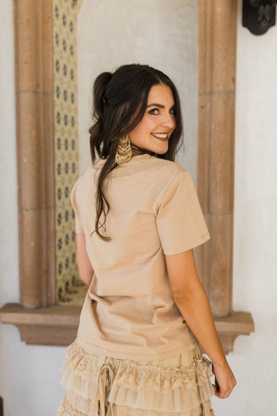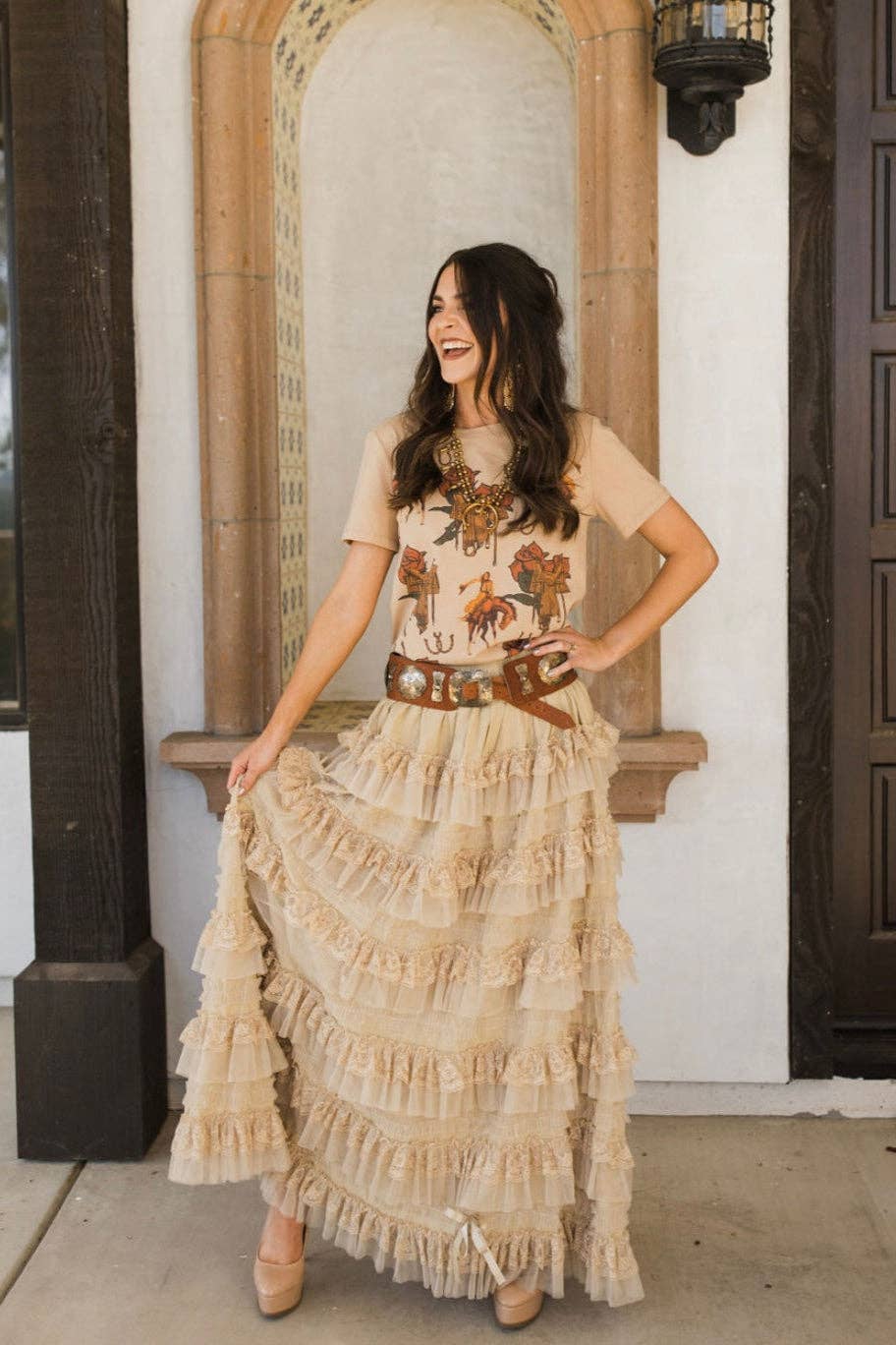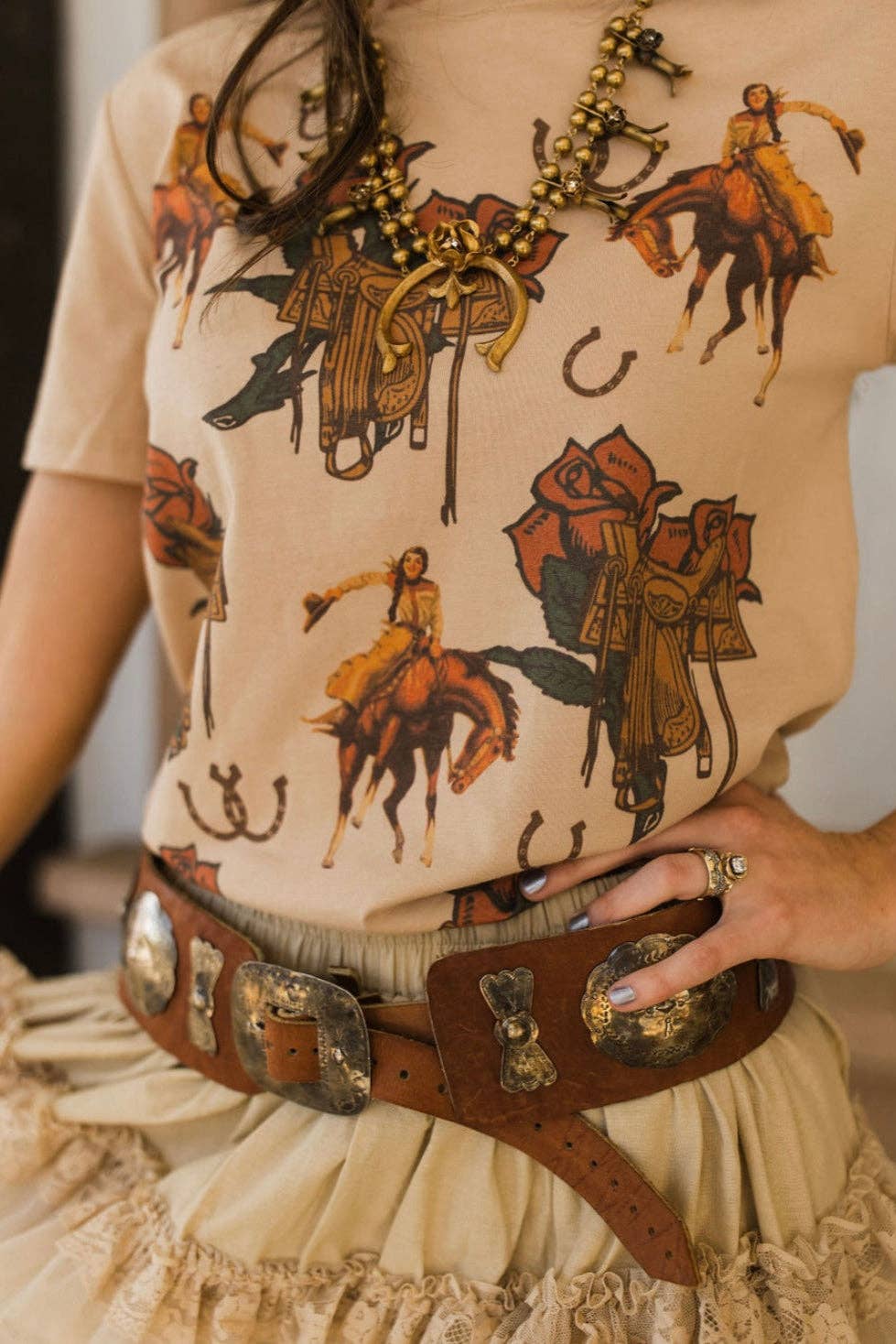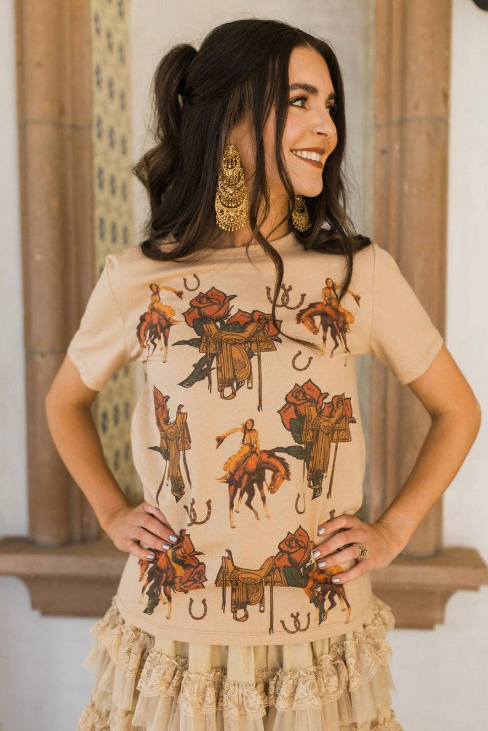 Long live rodeo! This soft tee honors the sport that’s always been close to our hearts and family roots. With a fun western print featuring illustrations of horseback cowgirls, saddles, horseshoes, and blooming roses, this tee showcases your love for rodeo in style. With a flattering fit on the body and longer sleeves, it’s sure to become a favorite!